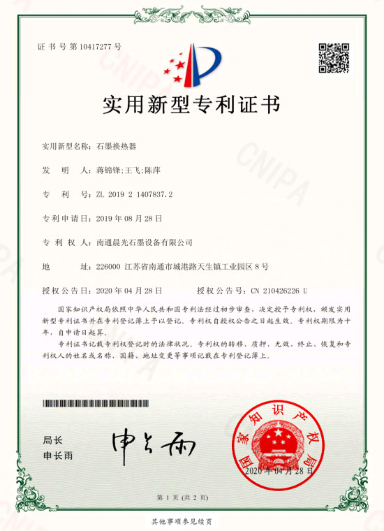 實(shí)用新型專利 :石墨換熱器 專利號:ZL 2019 2 1407837.2