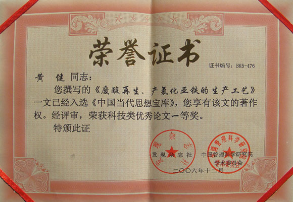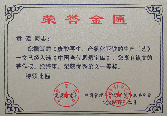 2006年12月,《廢酸再生、產氯化亞鐵的生產工藝》入選《中國當代思想寶庫》