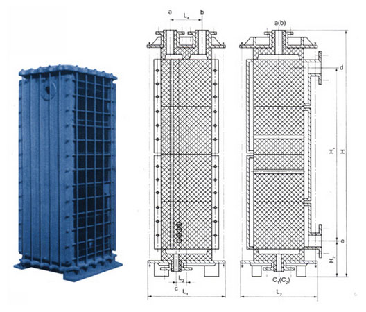 KS型側(cè)板為整體,增加上、下兩排緊固鏍柱,載熱體分布更均勻。相同換熱面積時矩形塊孔式設(shè)備高度比圓塊式小。本公司可據(jù)用戶要求生產(chǎn)外聯(lián)式、臥式安裝、雙向耐腐蝕等具有其它特性之矩形塊孔式石墨熱交換器。